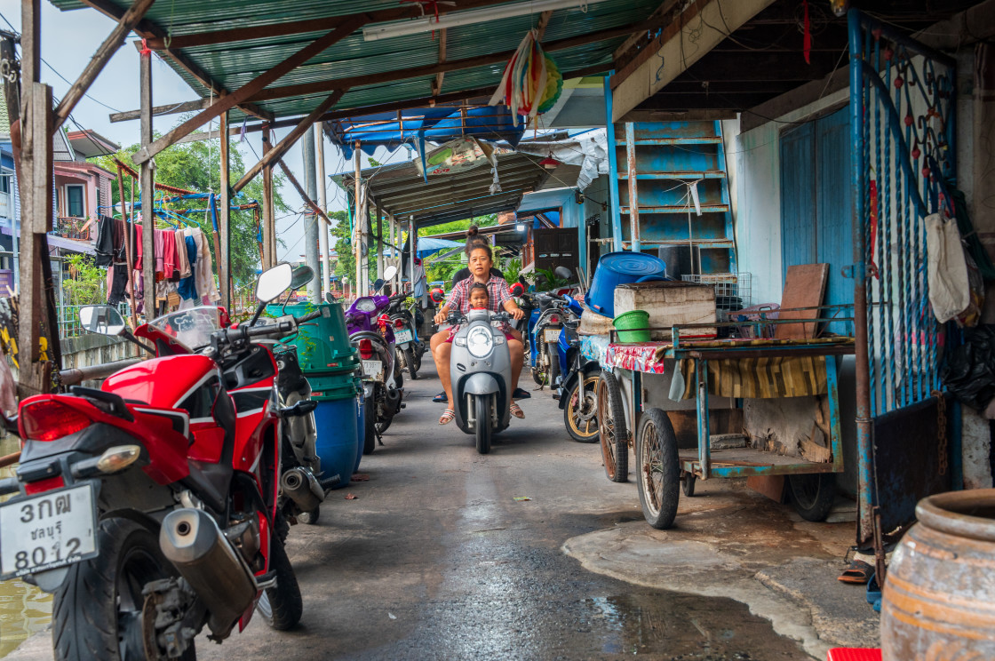 People on a scooter on a footpath next to a khlong or canal with residential buildings in Pattaya District Chonburi Thailand Asia